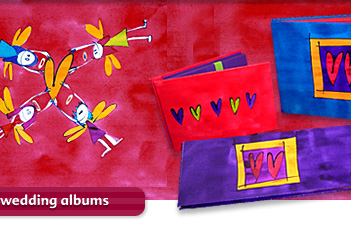 It can all be simply said with 2 hearts. BRAND NEW – LIMITED STOCKS – 45 ALBUMS ONLY. Medium photo albums are now available again. Each album has 30 pages (60 sides) and holds up to 120 4" x 6" photos with 5 x brown recycled paper journal sheets (could be used for wedding guest's signatures) in each album. $65 each. I have sourced a beautiful new book cloth (canvas that I paint and use on the covers) it does not need a sealer, so the colours are richer (but not quite as bright as before) and the surface is matt. By way of special order, your album can be personalised with names or a memorable quote from the occasion (I charge extra for this, contact me).
